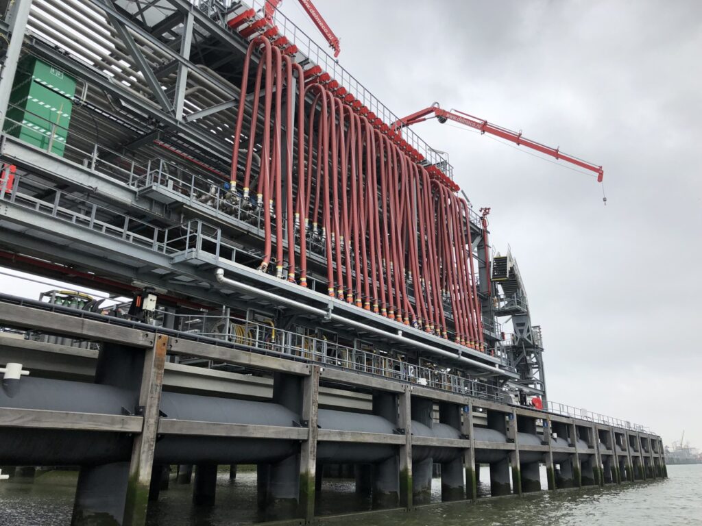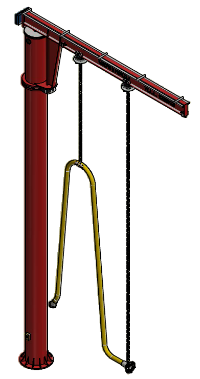 A very easy way to conect a hose to a ship. The sliding beam brings the end of the hose to the connection flange on the ship. The winches can be used to adjust the height.
